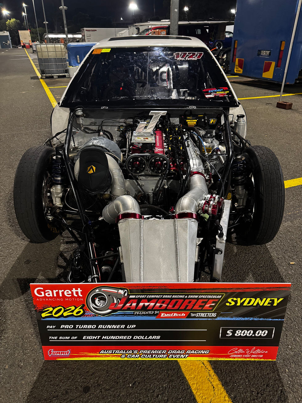 A key upgrade ahead of Sydney Jamboree included a cam gear adjustment, completed with support from Platinum Racing Products. Additional improvement with the fitment of an Innovators West damper and also a 112mm HPT Turbo ensured the car was dialled in for optimal performance.